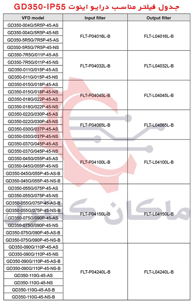 جدول فیلتر درایو اینوت GD350-IP55