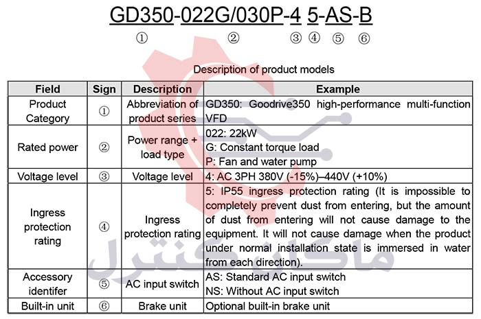 درایو GD350-IP55 در دو سری AS و NS تولید می شود. تفاوت این دو در وجود سوئیچ ورودی AC در سری AS می باشد که راحتی و امنیت را برای دستگاه فراهم می کند.