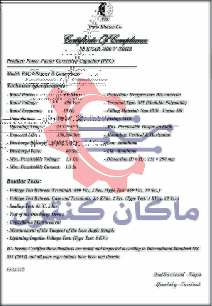 مشخصات خازن سه فاز PKC