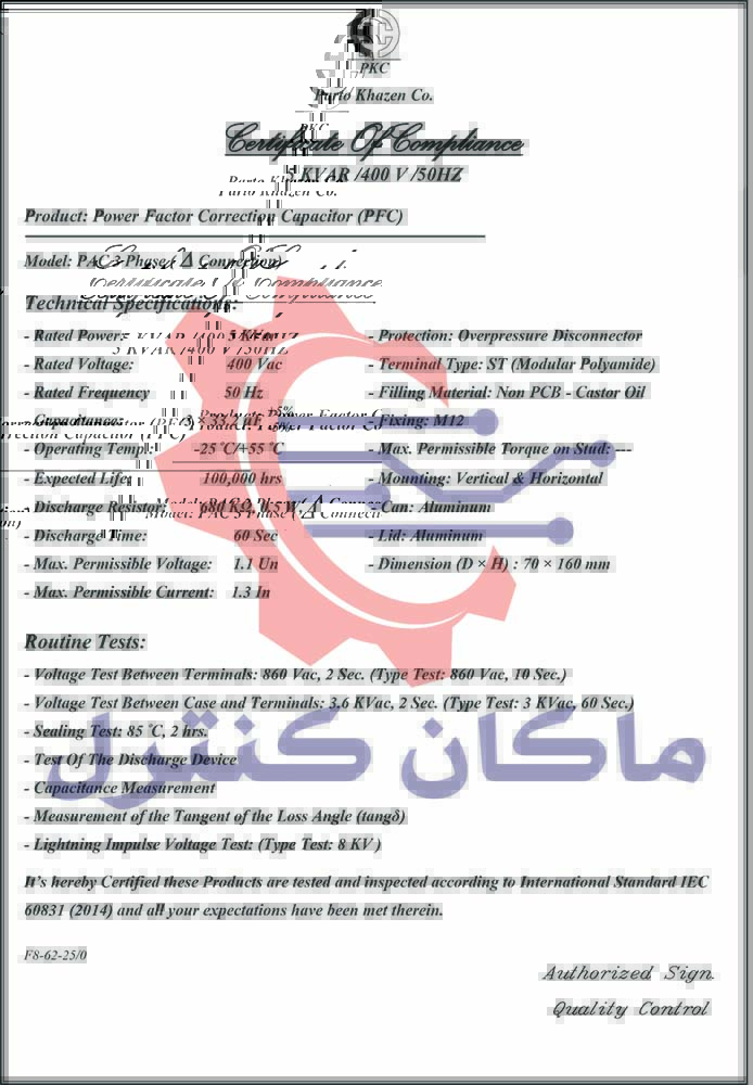مشخصات فنی خازن سه فاز خشک PKC 5KVAR 400V سیلندری