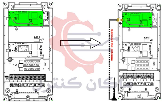 ابتدا کارت ارتباطی را به درایو متصل کرده، سپس در صورت نیاز پورت CN2 را به سوکت SMA آنتن خارجی متصل کرده و آنتن در بالاترین نقطه و خارج تابلو نصب شود.