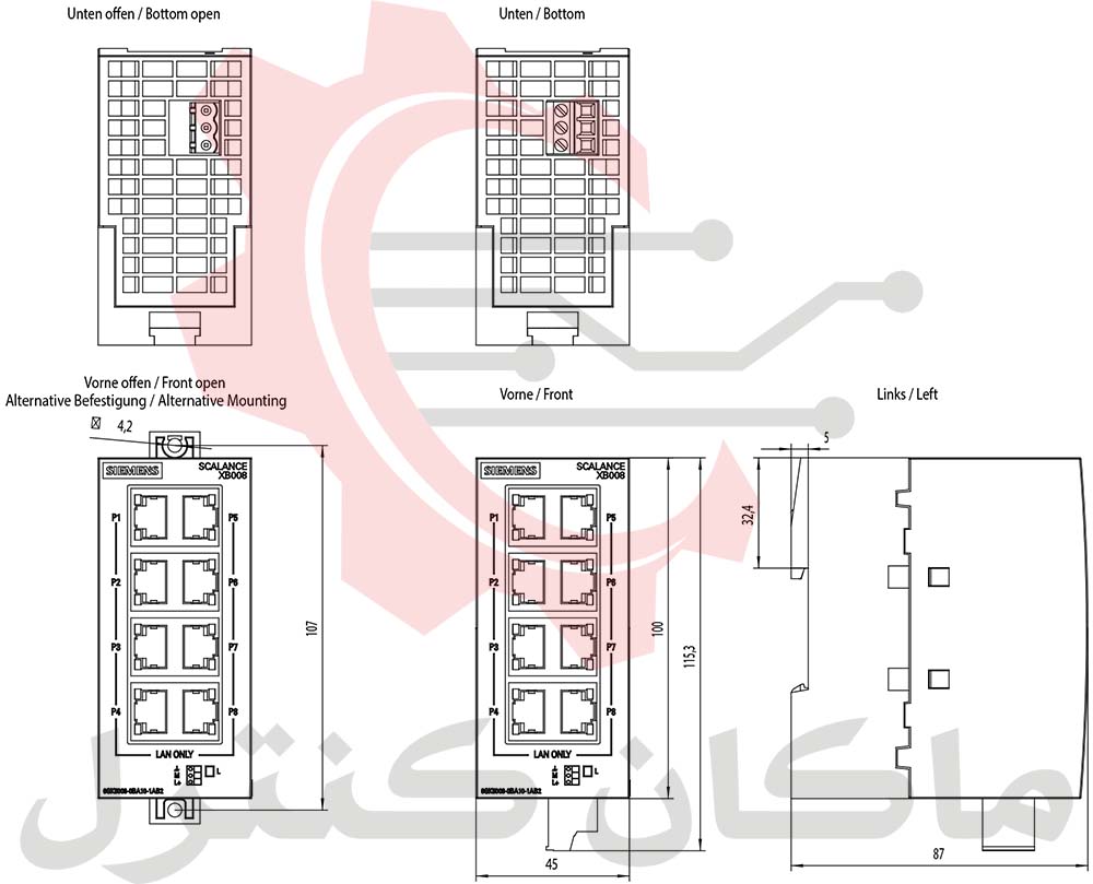 - 6GK5008-0BA10-1AB2: پورت اترنت سرعت انتقال 100Mbit/s – تغذیه 24VAC/DC (سری XB008)