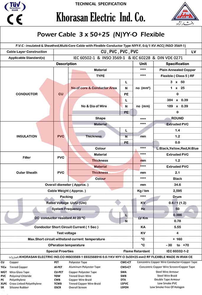 مشخصات فنی کابل افشان 25+50×3 خراسان افشارنژاد NYY-O
