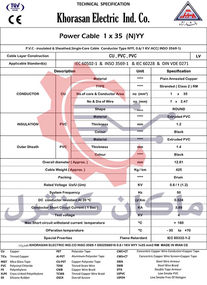 - جنس هادی: مس کلاس 2 مطابق استاندارد IEC 60228