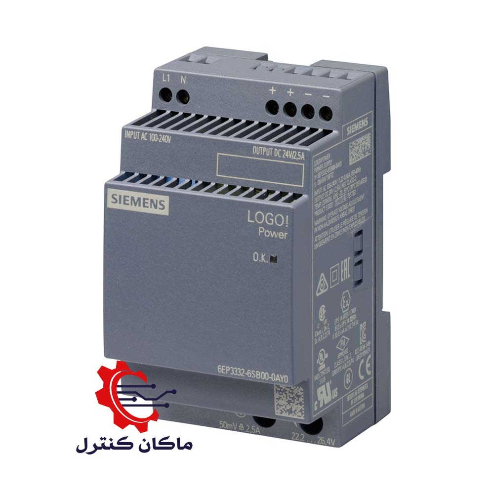 منبع تغذیه LOGO! POWER 24V /2.5A زیمنس جهت تامین ولتاژ و جریان PLC ها مورد استفاده قرار می گیرد. این منبع تغذیه SIEMENS با وجود اینکه از سری LOGO! SIEMENS می باشد اما می توان برای سری های مختلف و برند های مختلف پی ال اس از آن استفاده نمود.